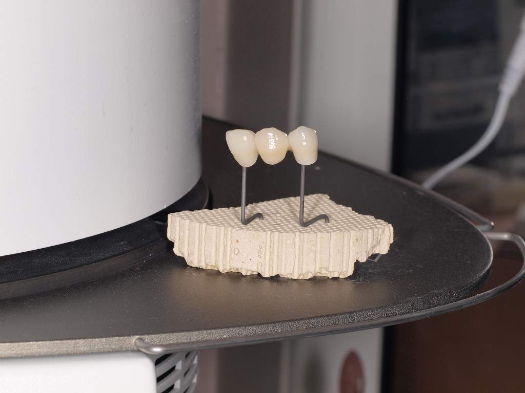 ジルコニアブリッジの7時間半かけてのシンタリング後、模型合わせ、内面調整ポーセレン築造へ 焼成中の画像になります。 焼き上げると青色のポーセレンもこんな色調を作り出していきます。 これから歯らしく見えるように仕上げていきます。 かなり綺麗になってきました。