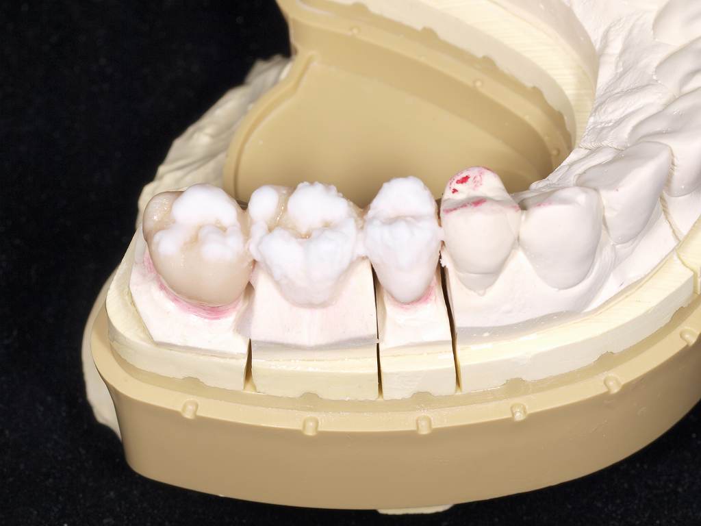 大臼歯部のジルコニアブリッジの作成。7時間半かけてのシンタリング後、模型合わせ、内面調整ポーセレン築造へ 焼成中の画像になります。 焼き上げると青色のポーセレンもこんな色調を作り出していきます。 最終仕上げで強度も兼ね備えながらいかに審美的にきれいに仕上げるかが勝負です。