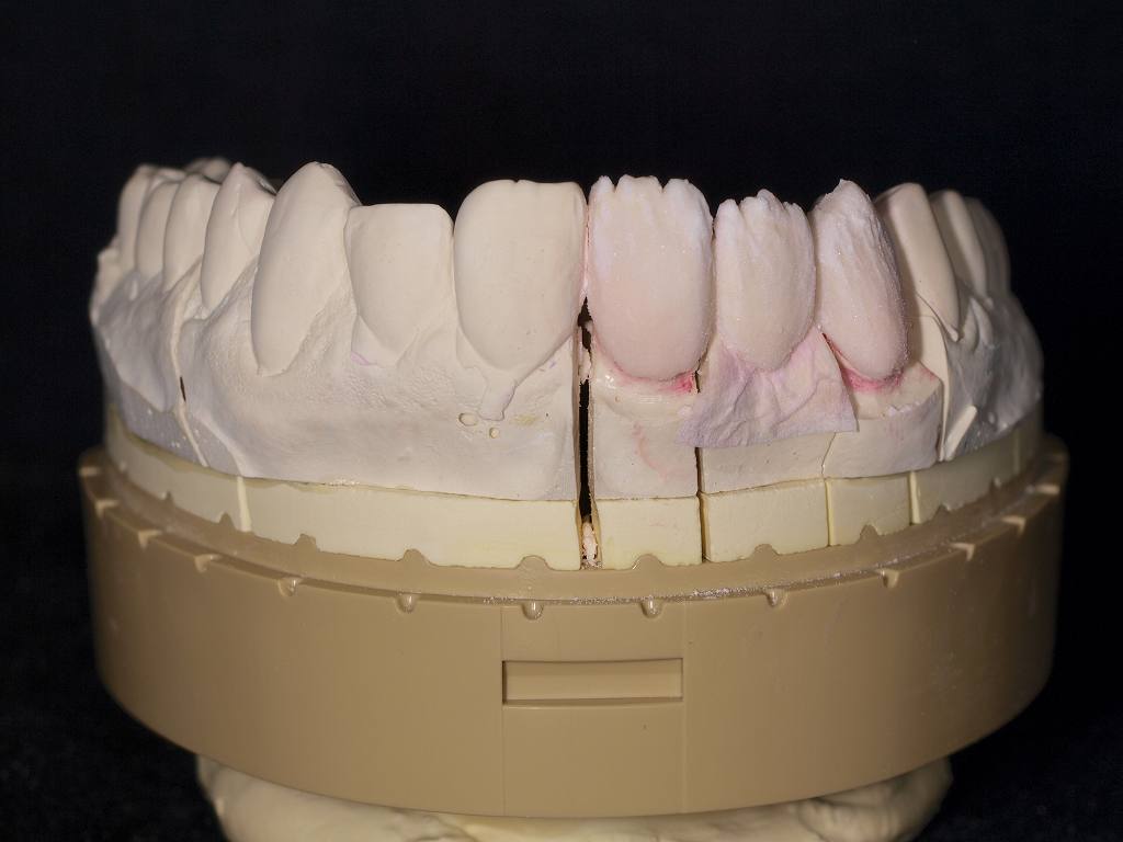 ジルコニアブリッジの7時間半かけてのシンタリング後、模型合わせ、内面調整ポーセレン築造へ 焼成中の画像になります。 焼き上げると青色のポーセレンもこんな色調を作り出していきます。1本8万円