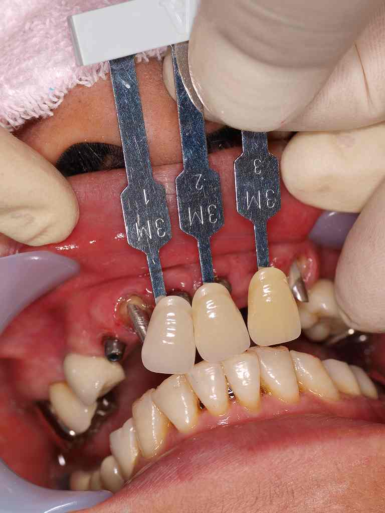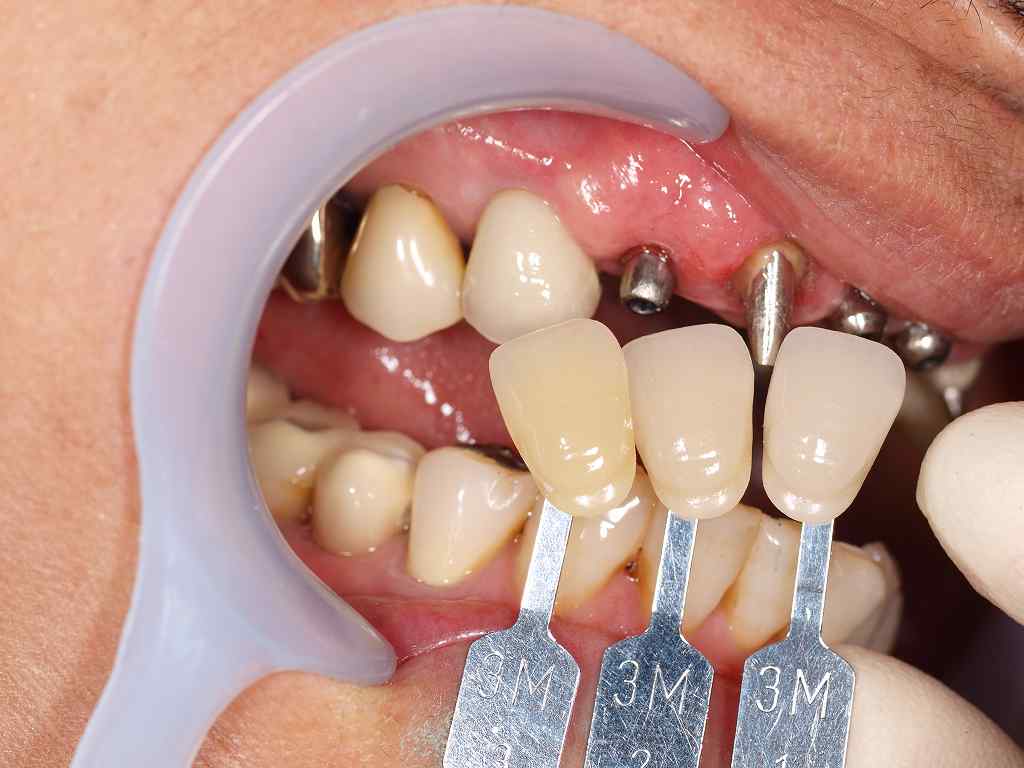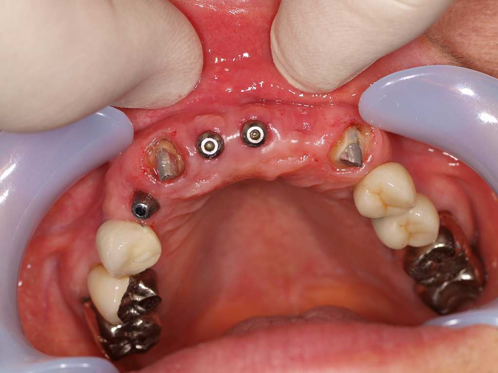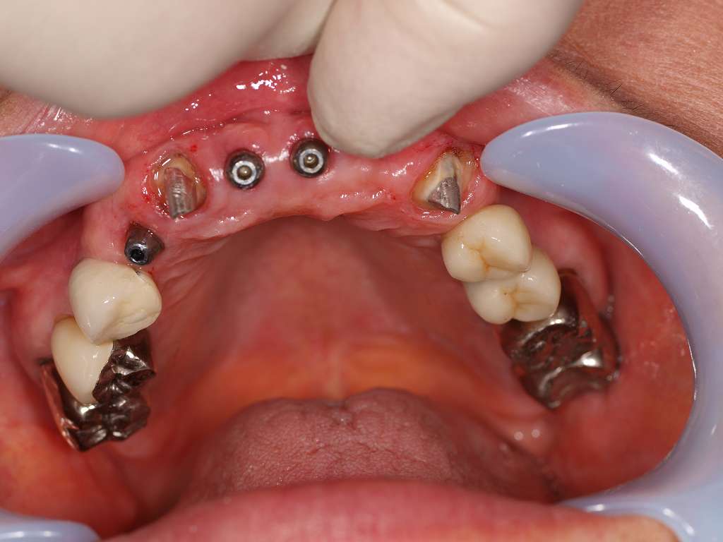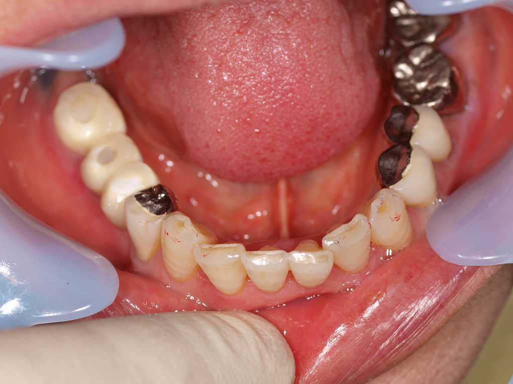 過蓋咬合にて保険の前歯のブリッジが歯牙破折により崩壊 インプラント治療にて前歯部の咬合を再度維持