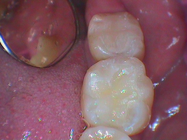 左下の奥の銀歯を外して虫歯治療 昔の銀歯の下は大きく虫歯になっていることがあります セラミックを用いた審美治療